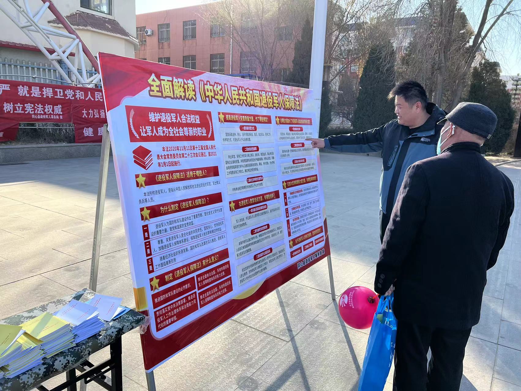 在县新时代文明实践广场,县退役军人事务局摆放宣传展板、设立宣传咨询台、悬挂宣传标语,就群众关注的退役军人就业创业、现役军人家属优抚、适龄青年入伍等涉军法律法规政策向群众耐心解答,并发放法治宣传“大礼包”等,切实做好《退役军人保障法》等普法宣传。