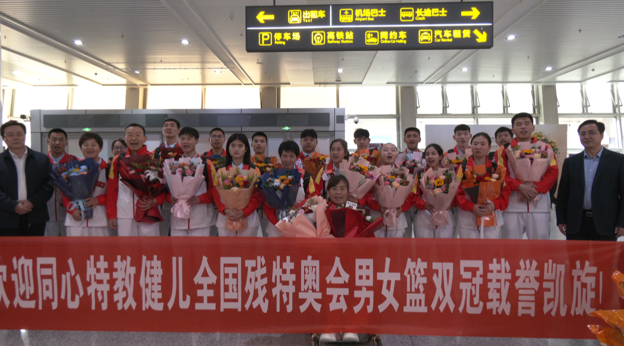 12月16日,县领导及相关部门负责人在河东机场,热烈欢迎参加全国第十二届残疾人运动会暨第九届特殊奥林匹克运动会的运动员载誉归来。
