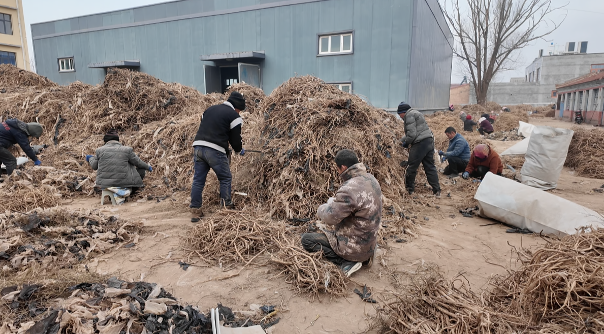 寒冬时节,本该是农闲休整的时节,预旺镇的中药材市场却是一派热火朝天的繁忙景象。空气中弥漫着浓郁的药香,百余名村民正围在中药材堆旁,按照大小、品相精细分拣,分拣好的药材整齐码放在一旁,等待后续加工包装。