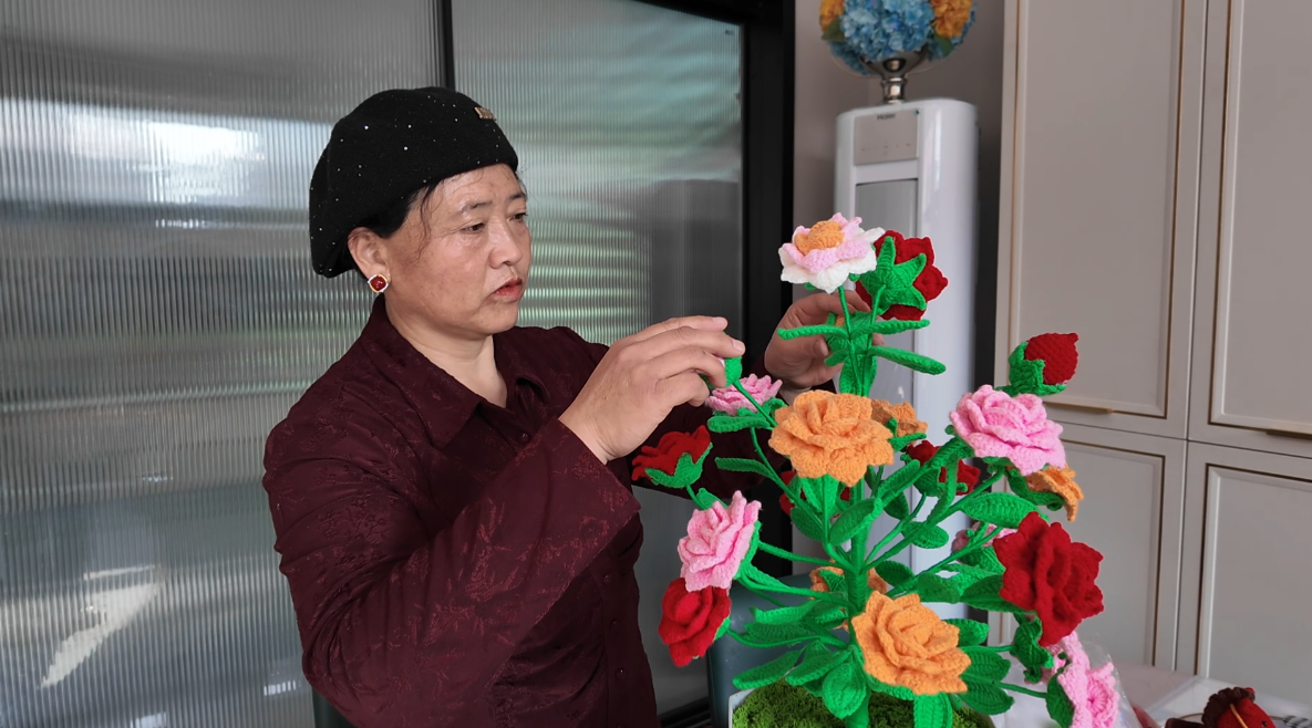 编织我挺喜欢的,去年村上来培训了编织,我也去学了,平时我就在家里钩一钩花花草草,把家里装饰一下。