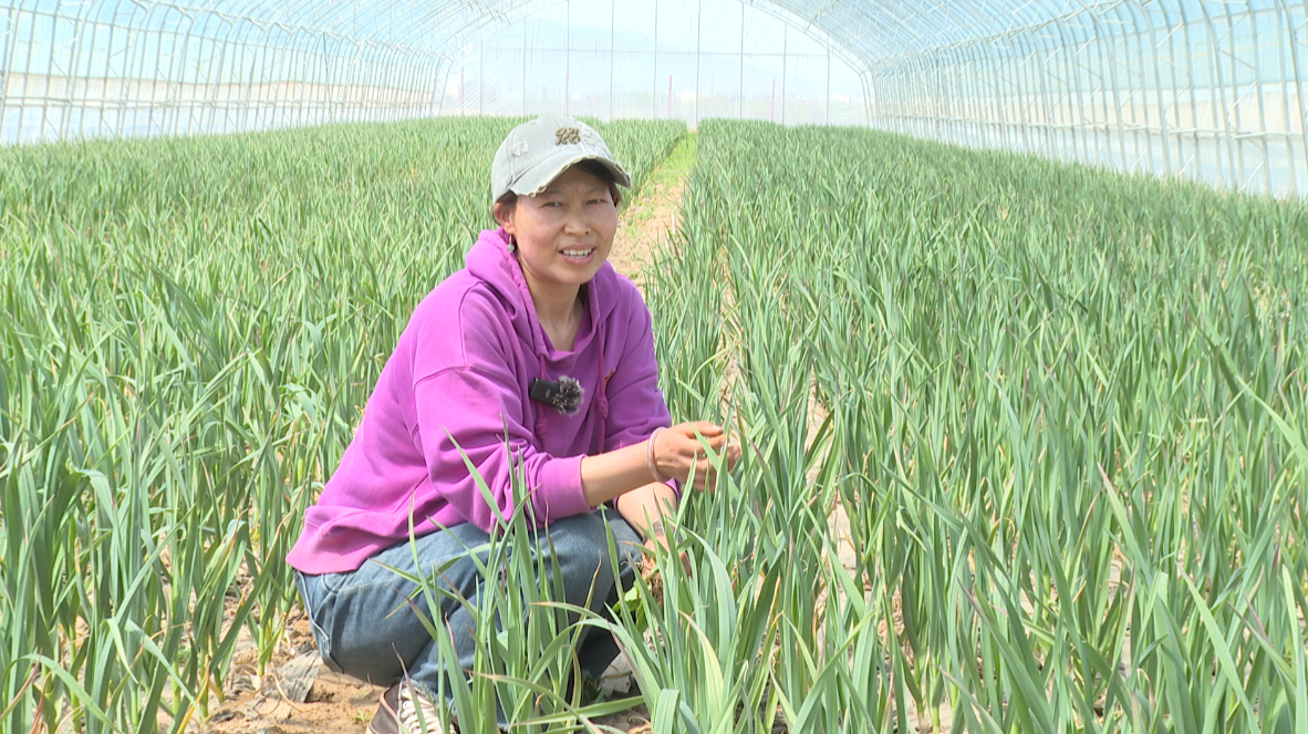 从我们下马关镇建设大棚开始,我就一直在这里干活。我今年在大蒜棚上干活,一天能挣140元到150元。在家门口,孩子也照顾了、钱也赚到了,很方便。