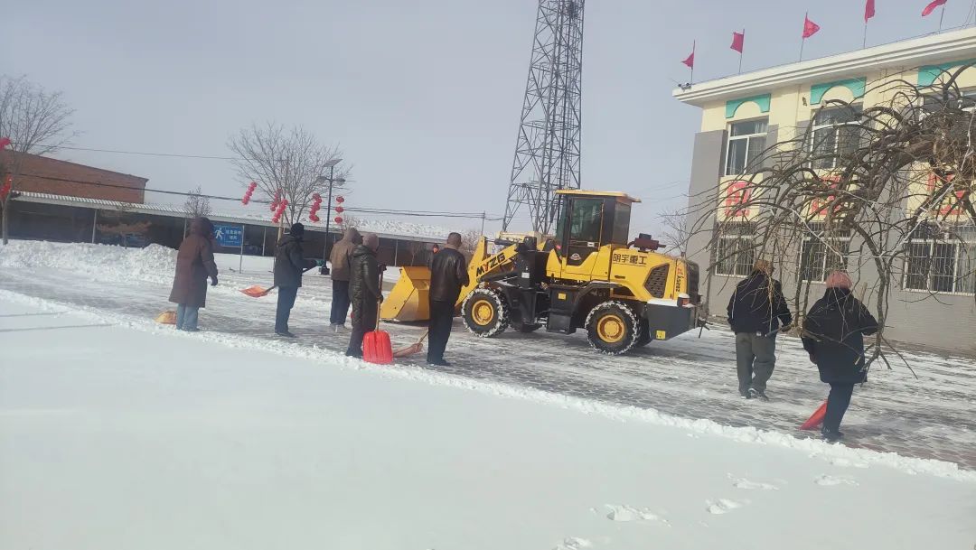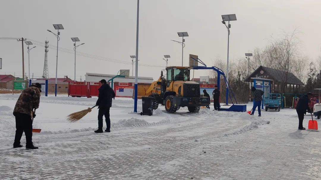 除了人力清扫,镇村及时调配铲车参与除雪工作。轰鸣的铲车在雪堆中来回穿梭,巨大的铲斗轻松地将厚重的积雪铲起,随后倾倒在林带、农田,为后续清扫工作打下基础。