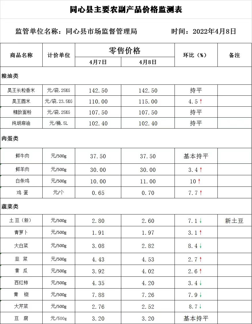4月8日同心县主要农副产品价格监测表