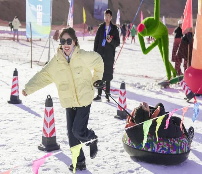 伴随着汽笛的鸣响,整个滑雪场沸腾起来。除了雪上单板、双板、雪地摩托等冰雪体验项目外,还设有龙年顶呱呱、时来运转等三大趣味互动项目和雪上旱地冰壶挑战赛、雪地飞盘九宫格挑战赛等五项达标挑战活动以及网红“北极熊”巡游互动等系列主题活动,让所有人感受到了冰天雪地里火辣辣的热情。